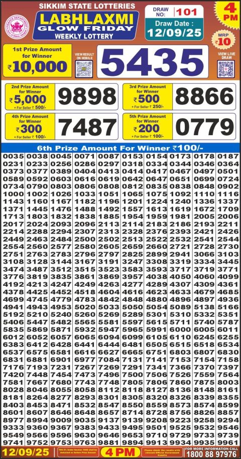 12 September 2025 4pm – Sikkim State Labhlaxmi lottery 4pm Result has been declared for 12/09/2025 . The First prize…