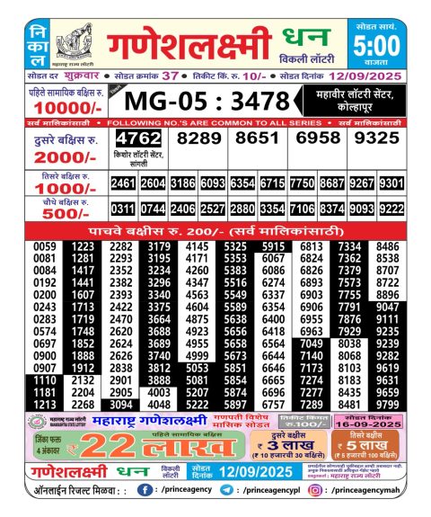 Maharashtra Ganeshlaxmi Weekly Lottery 5PM Result 12.09.2025