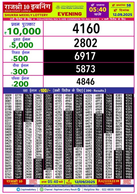 12 September 2025 5.40pm – Goa state Rajshree 10 lotteries 5.40pm Result has been declared for 12/09/2025 . First prize…