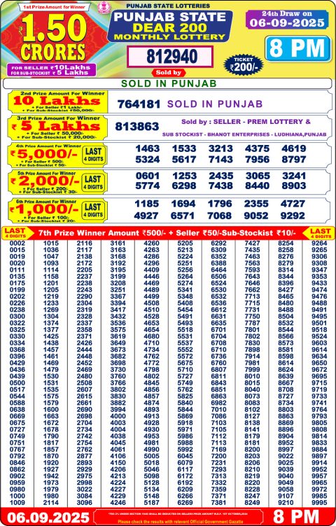 PUNJAB STATE 200 MONTHLY LOTTERY RESULT 06-09-2025 8pm