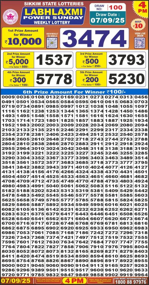 07 September 2025 4pm – Sikkim State Labhlaxmi lottery 4pm Result has been declared for 07/09/2025 . The First prize…