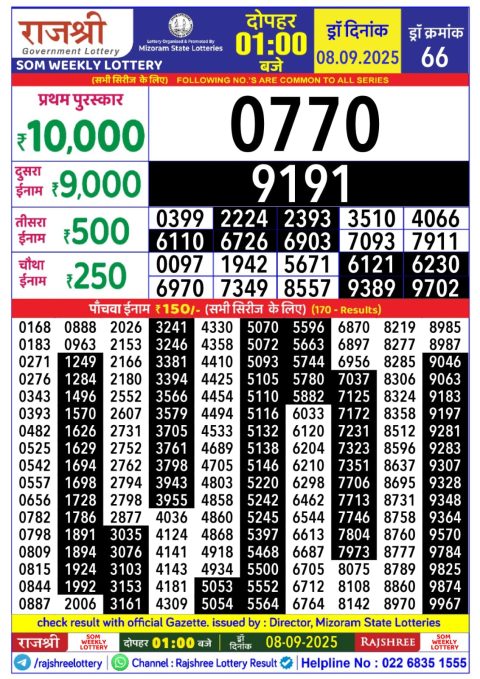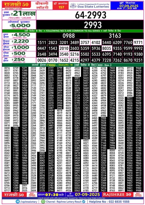 07 September 2025 8.30pm – Goa state Rajshree 30 Lotteries 8.30pm Result has been declared for 07/09/2025 . First prize…