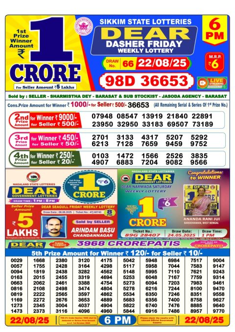 Dear Daily Lottery 6PM Result 22.08.2025
