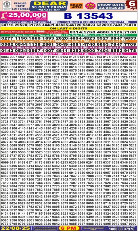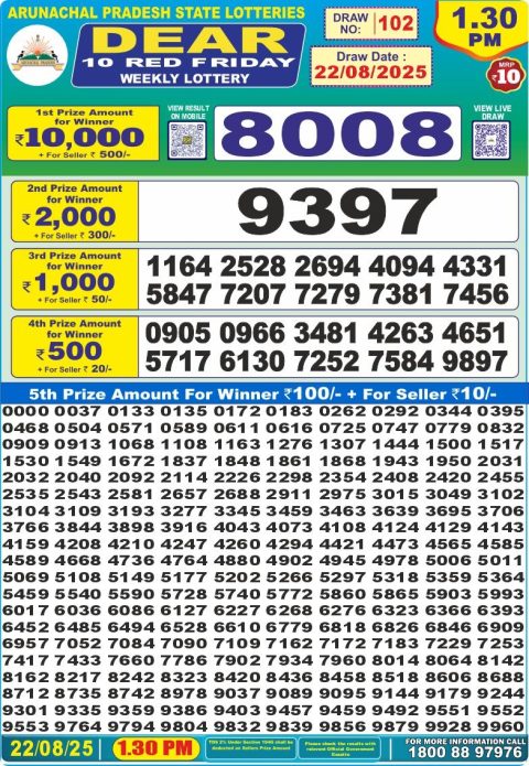 Dear Daily Lottery 1PM Result 22.08.2025