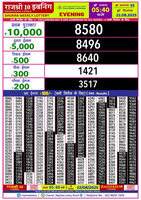 Rajshree 10 Daily Lottery 5.40PM Result 22.08.2025