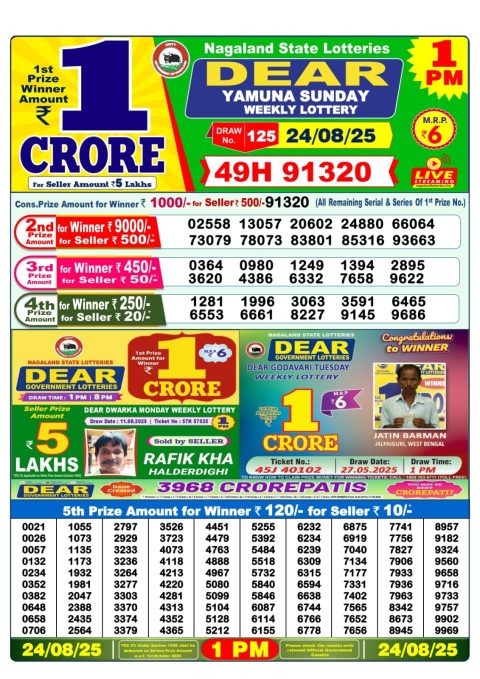 Dear Daily Lottery 1PM Result 24.08.2025