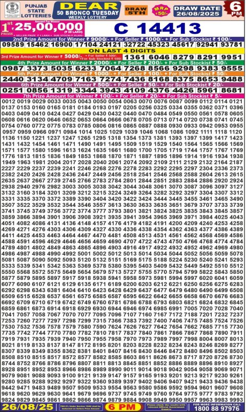 26 August 2025 6pm – punjab state Dear Lotteries 6pm Result has been declared for 26/08/2025 . First prize 25,00,000…