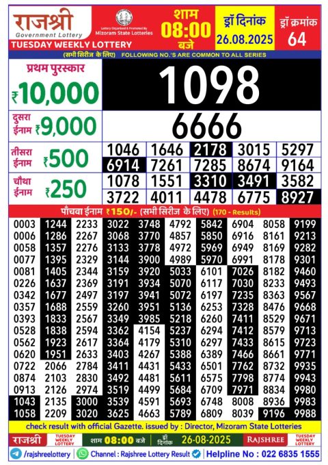 26August 2025 1pm – rajshree mizoram state Lotteries 1pm Result has been declared for 26/08/2025 . First prize rs 10,000Winning…