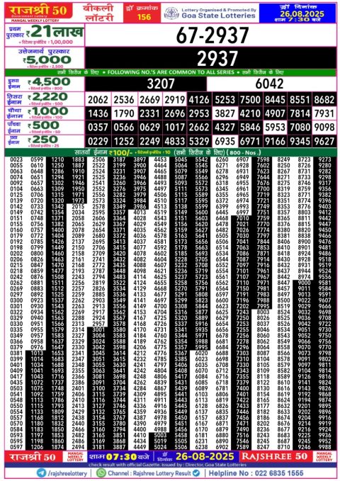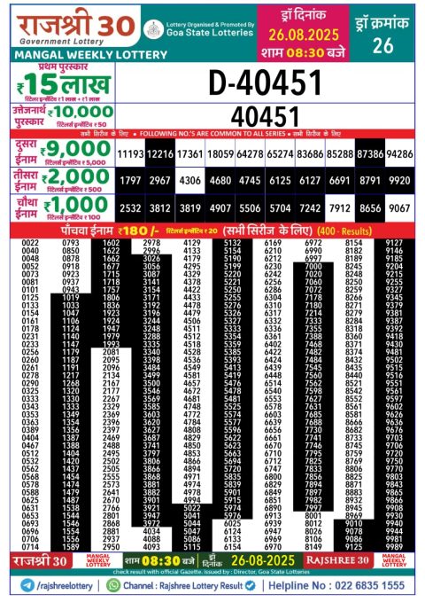 26 August 2025 8.30pm – goa state Lotteries Rajshree30 .8.30pm. Result has been declared for 26/08/2025 . First prize rs…