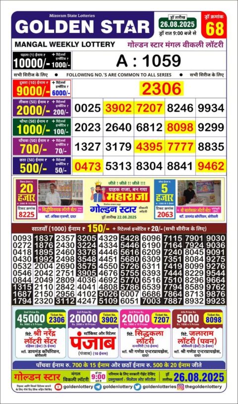 26 August 2025 9pm – mizorom state Lotteries.golden star Lottery 9pm Result has been declared for 26/08/2025 . The First…