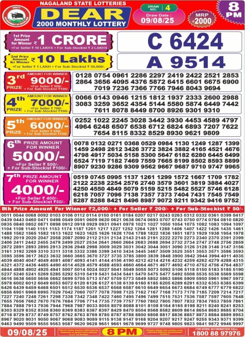 Dear 2000 Monthly Lottery 8PM Result 09.08.2025