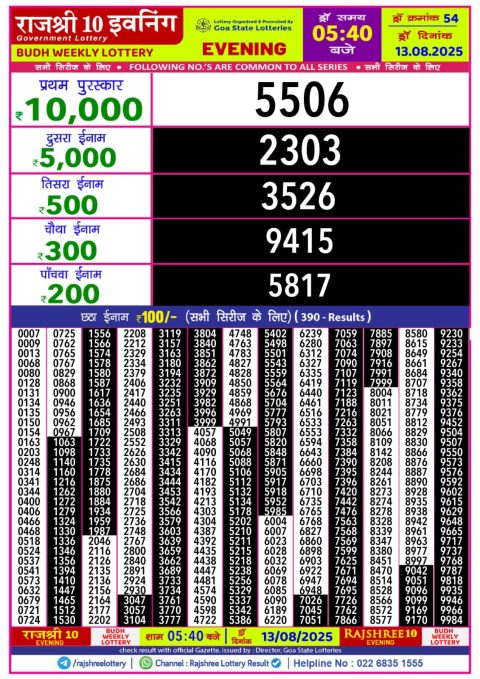 Rajshree 10 Daily Lottery 5.40PM Result 13.08.2025