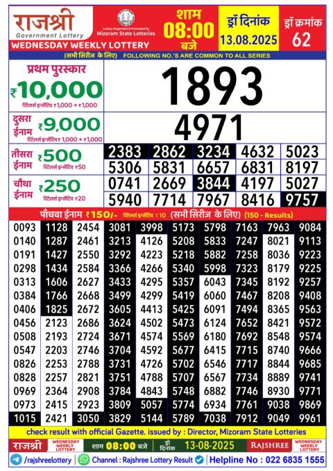 Rajshree Daily Lottery 1PM Result 14.08.2025