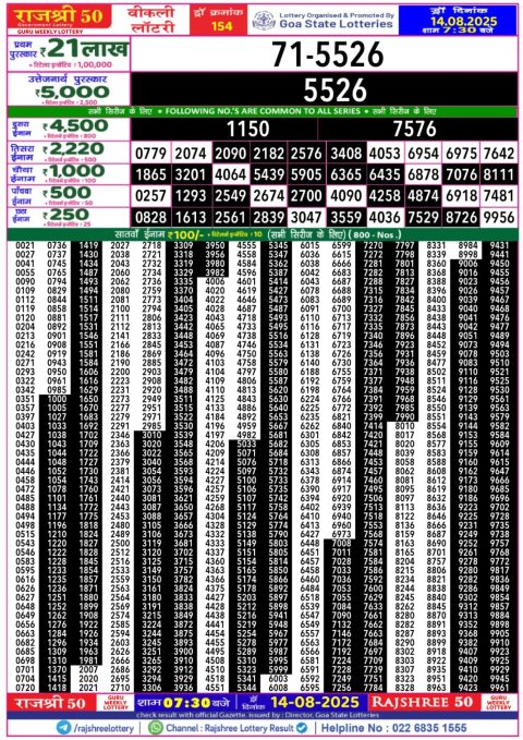 Rajshree 50 Weekly Lottery 7:30PM Result 14.08.2025