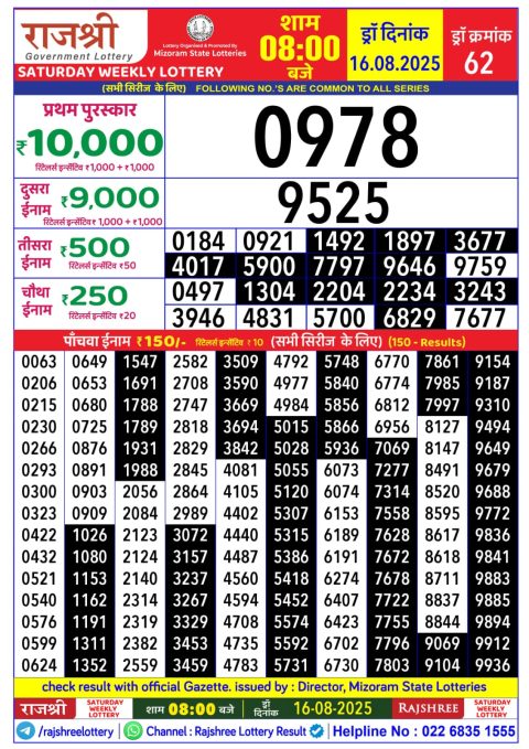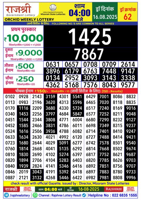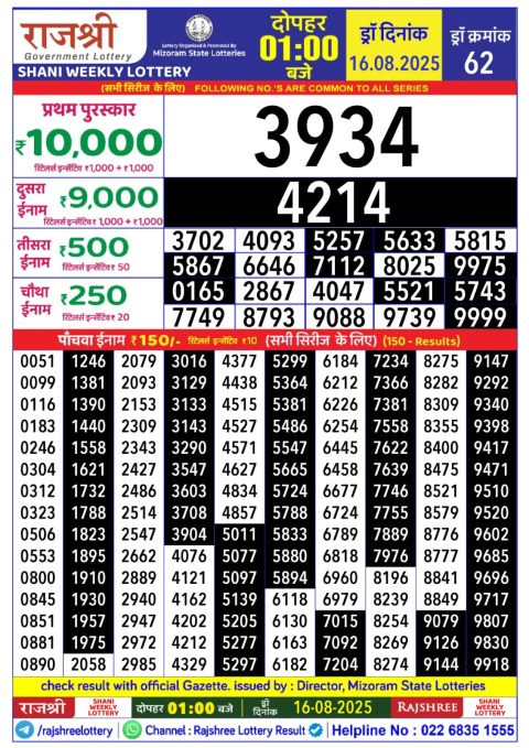 Rajshree Daily Lottery 1PM Result 16.08.2025