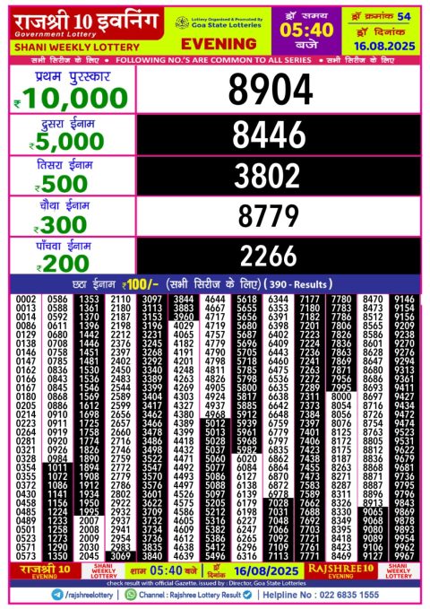 Rajshree 10 Daily Lottery 5.40PM Result 16.08.2025