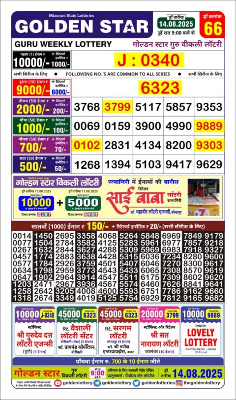 Golden Star Daily Lottery 9PM Result 14.08.2025