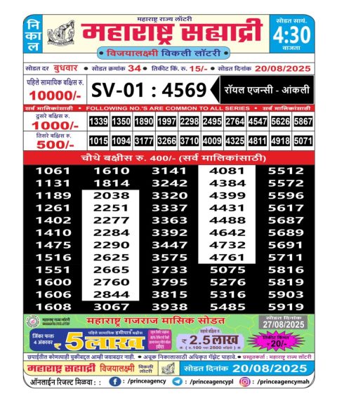 Maharashtra Weekly Lottery 4.15PM Result 20.08.2025