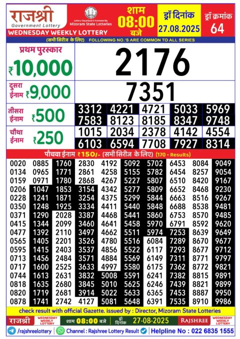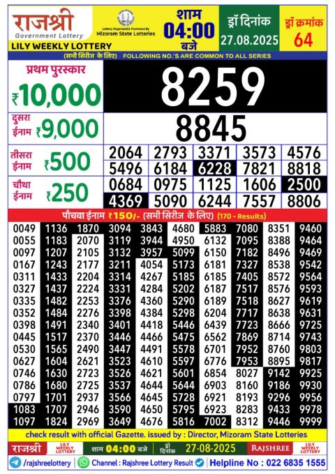 27August 2025 4pm – rajshree mizoram state Lotteries 4pm Result has been declared for 27/08/2025 . First prize rs 10,000Winning…