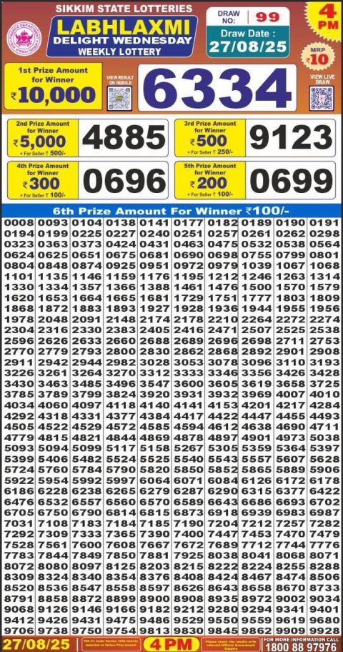 27August 2025 4pm – Sikkim State Labhlaxmi lottery 4pm Result has been declared for 27/08/2025 . The First prize 10,000…