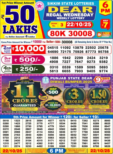 Sikkim State Dear Lottery 6PM Result 22.10.2025
