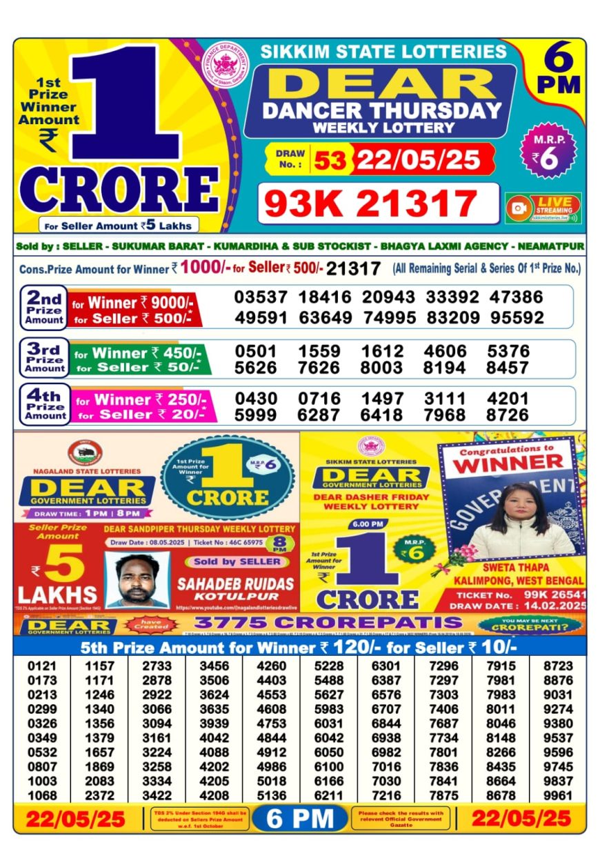 Dear Daily Weekly Lottery 6 Pm Result 22.05.2025 May 22, 2025 Leave a comment Related Results Golden Star Daily Lottery 9 Pm Result 27.06.2025 Maharashtra Ganeshlaxmi Weekly Lottery 5 Pm Result 22.05.2025 Maharashtra Gajlaxmi Weekly Lottery 4.45PM Result 31.08.2025