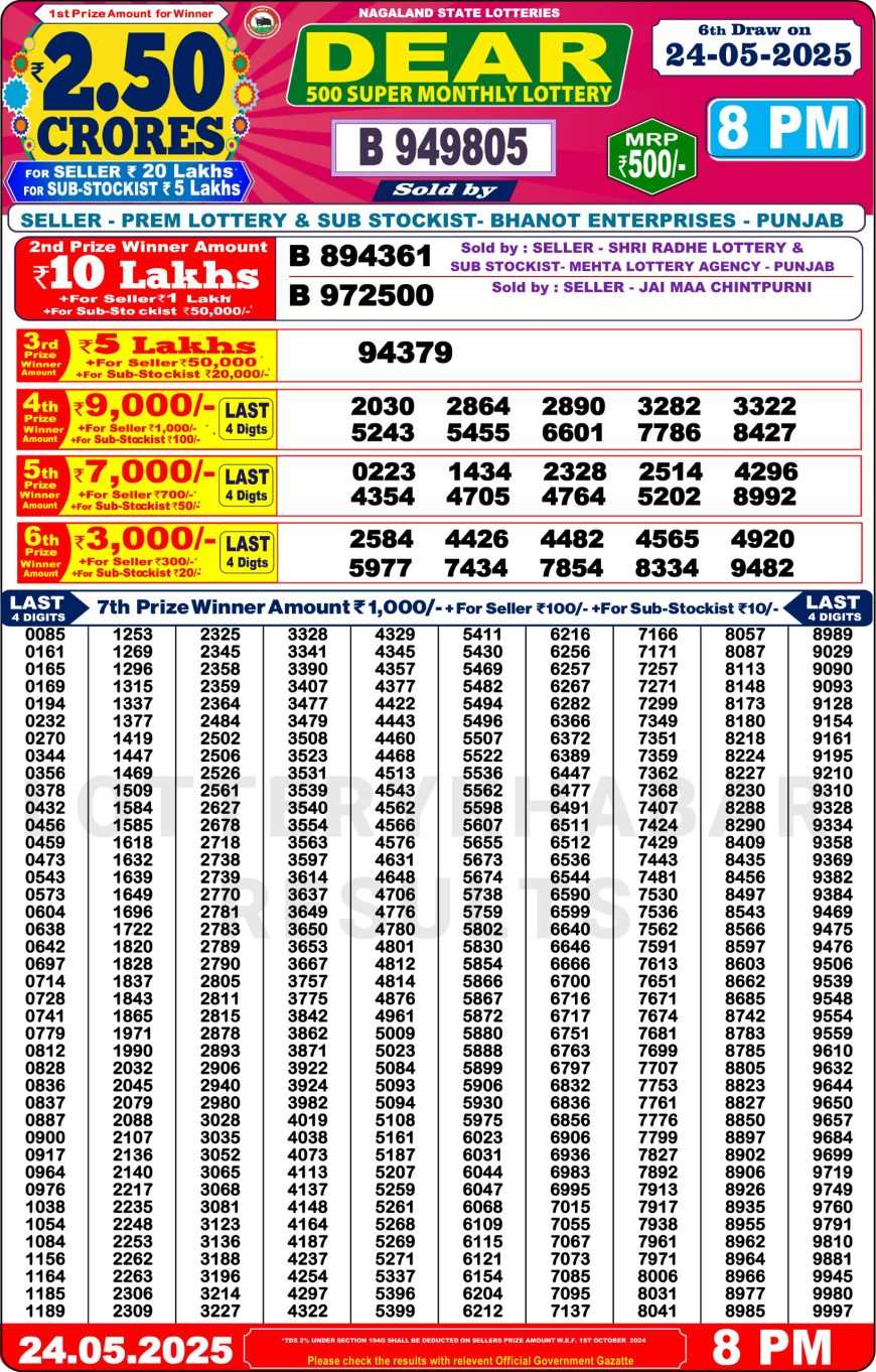 Dear 500 Super Monthly Lottery 8 PM Result 24.05.2025