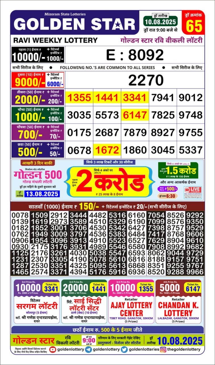 Golden Star Daily Lottery 9PM Result 10.08.2025 August 10, 2025 Leave a comment Related Results Rajshree Daily Lottery 8 PM Result 08.05.2025 Rajshree 50 Daily Lottery 7.30 Pm Result 1.06.2025 Maharashtra Gourav Monthly Result 15.10.2025