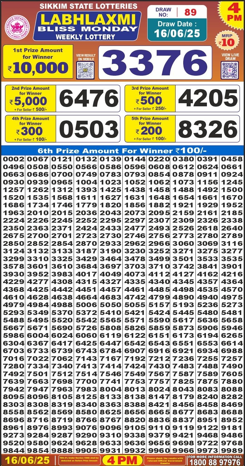 Labh Laxmi Daily Lottery 4 Pm Result 16.06.2025 June 16, 2025 Leave a comment Related Results Dear Super Daily Lottery 7 Pm Result 17.05.2025 Nagaland State Dear Lottery 1PM Result 04.10.2025 Golden Star Daily Lottery 9 Pm Result 20.05.2025