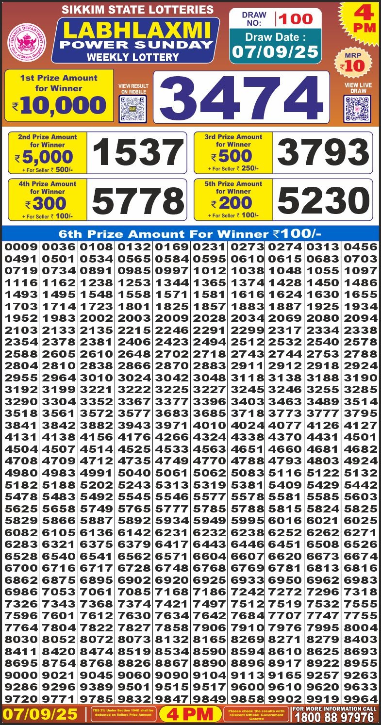 07 September 2025 4pm – Sikkim State Labhlaxmi lottery 4pm Result has been declared for 07/09/2025 . The First prize Winning Ticket number is 3474.Rest of the result is published here for your reference.