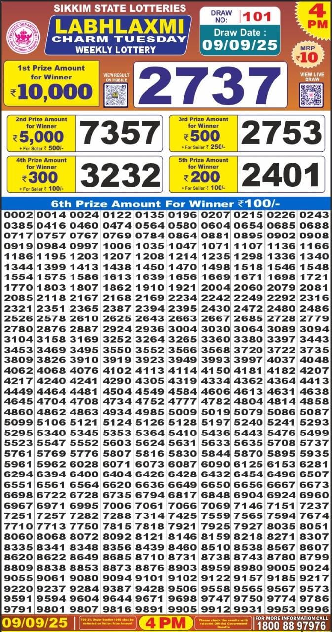 Labh Laxmi Daily Lottery 4PM Result 09.09.2025 September 9, 2025 Leave a comment 09 September 2025 4pm – Sikkim State Labhlaxmi lottery 4pm Result has been declared for 09/09/2025 . The First prize Winning Ticket number is 2737. Rest of the result is published here for your reference. Related Results Labh Laxmi Daily Lottery 4PM Result 17.09.2025 Maharashtra Ganeshlaxmi Weekly Lottery 5PM Result 26.07.2025 Rajshree Daily Lottery 8PM Result 26.08.2025