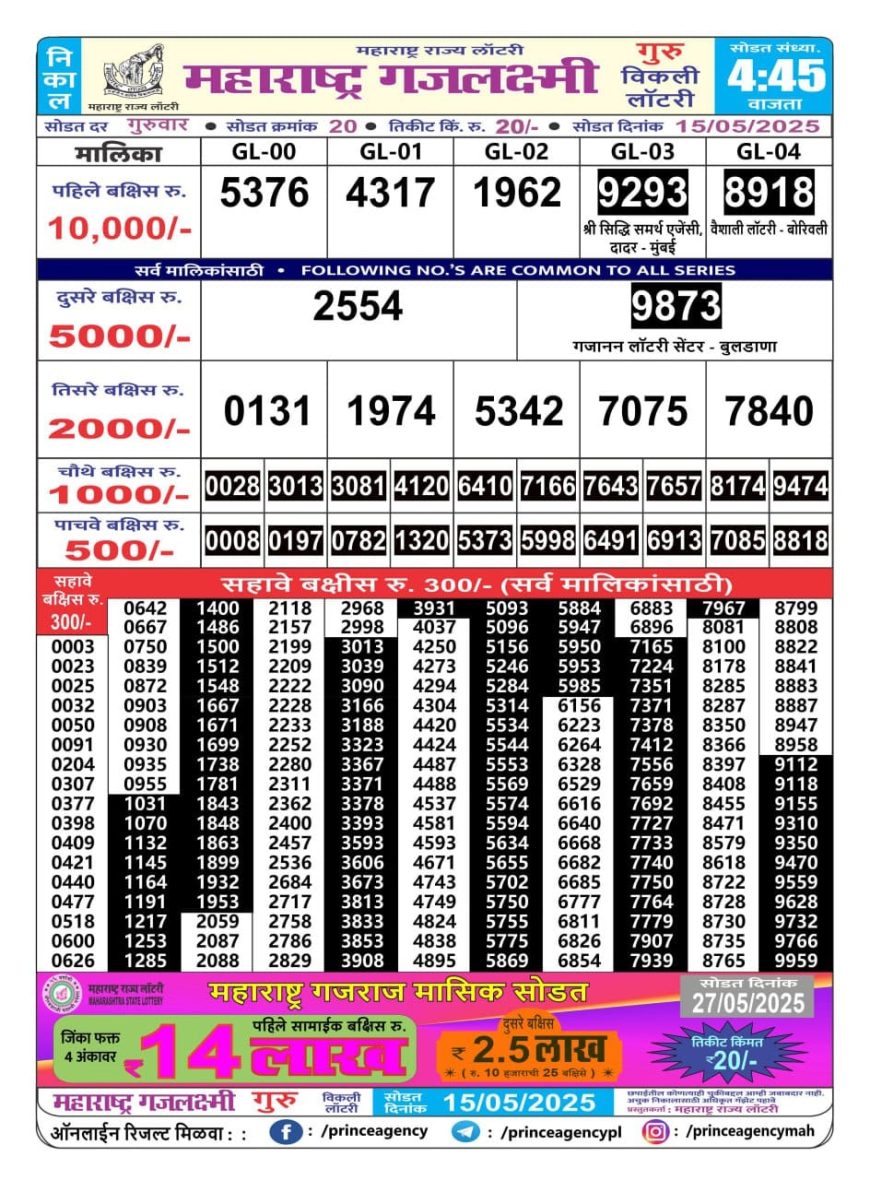 Maharashtra Gajlaxmi Weekly Lottery 4.45 Pm Result 15.05.2025 May 15, 2025 Leave a comment Related Results Maharashtra Ganeshlaxmi Weekly Lottery 5 PM Result 06.05.2025 Dear 10 Daily Lottery 1:30PM Result 31.07.2025 Labh Laxmi Daily Lottery 4 PM Result 01.05.2025