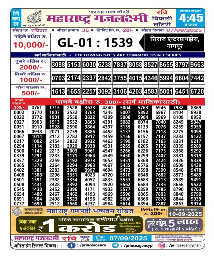 Maharashtra Gajlaxmi Weekly Lottery 4.45PM Result 07.09.2025