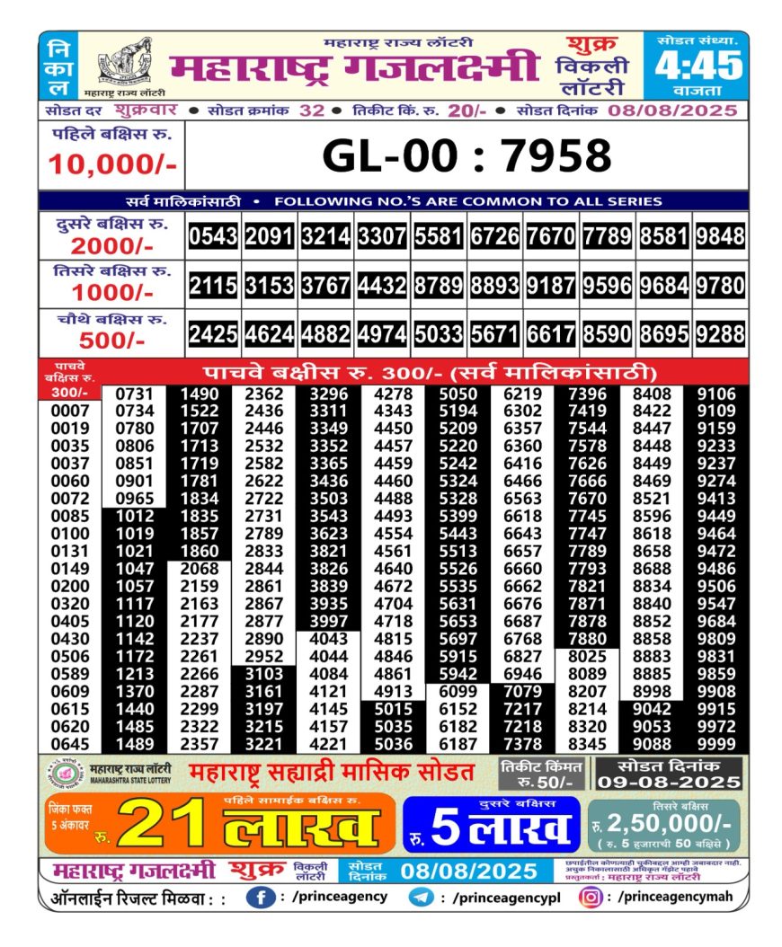 Maharashtra Gajlaxmi Weekly Lottery 4.45PM Result 08.08.2025