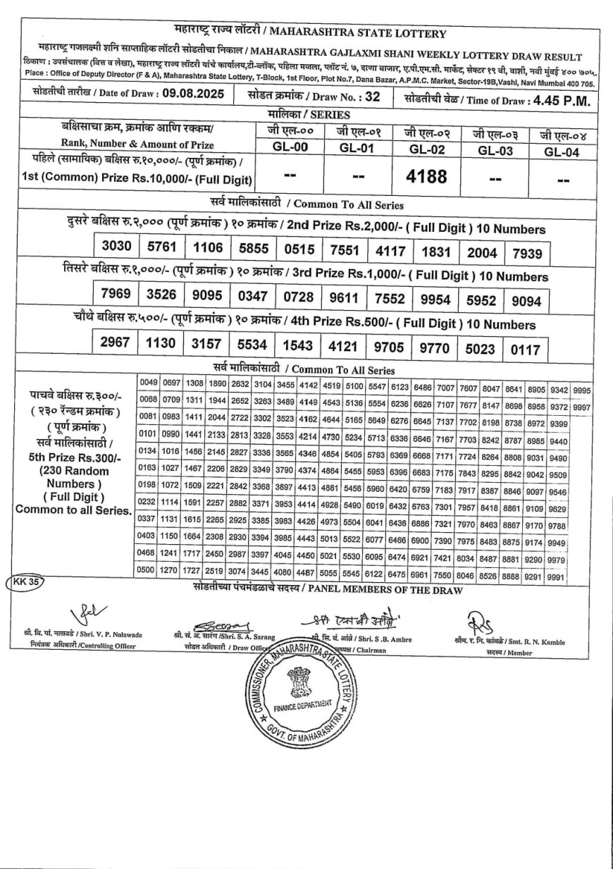 Maharashtra Gajlaxmi Weekly Lottery 4.45PM Result 09.08.2025 August 9, 2025 Leave a comment Related Results Dear Daily Lottery 8 PM Result 18.07.2025 Dear Super Daily Lottery 7 Pm Result 13.05.2025 Maharashtra Ganeshlaxmi Weekly Lottery 5 PM Result 09.07.2025