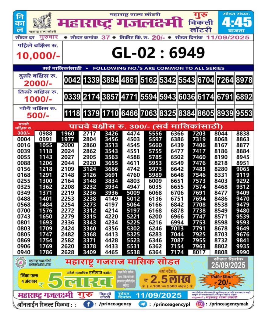Maharashtra Gajlaxmi Weekly Lottery 4.45PM Result 11.09.2025