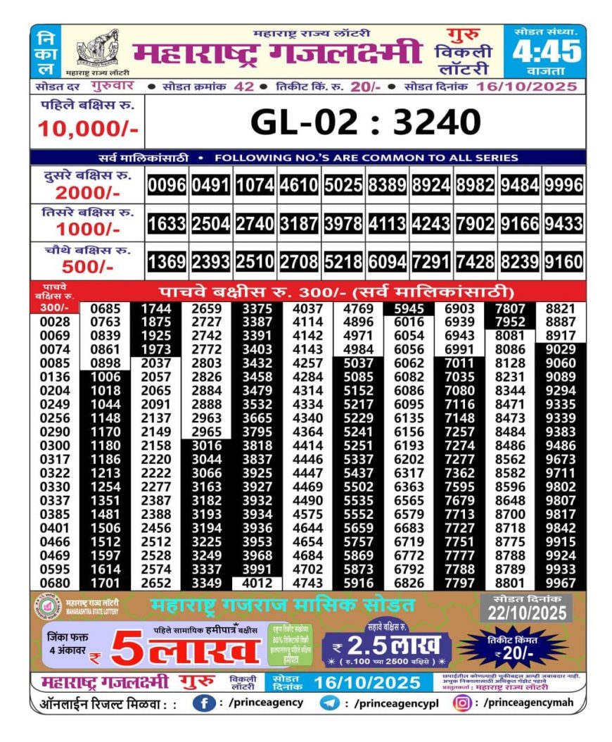 Maharashtra Gajlaxmi Weekly Lottery 4.45PM Result 16.10.2025 October 16, 2025 Leave a comment Related Results Maharashtra Ganeshlaxmi Weekly Lottery 4.15 PM Result 04.07.2025 Maharashtra Ganeshlaxmi Weekly Lottery 5PM Result 06.08.2025 Punjab State Dear 50 Daily Lottery 6PM Result 30.08.2025