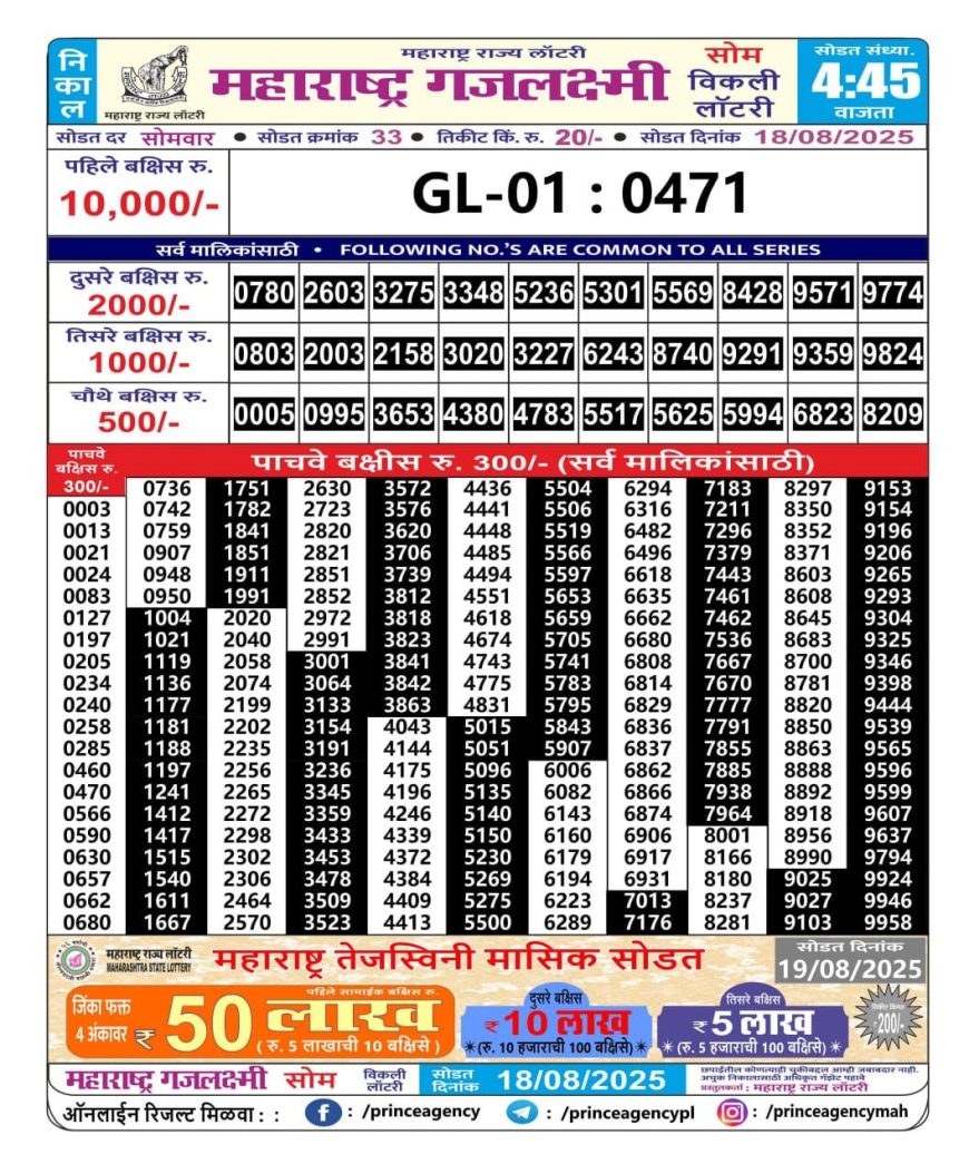 Maharashtra Gajlaxmi Weekly Lottery 4.45PM Result 18.08.2025