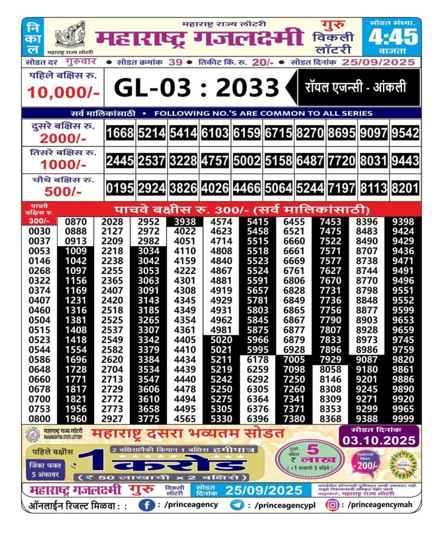 Maharashtra Gajlaxmi Weekly Lottery 4.45PM Result 25.09.2025