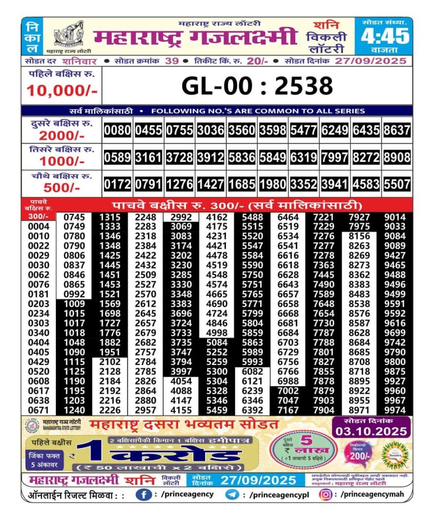 Maharashtra Gajlaxmi Weekly Lottery 4.45PM Result 27.09.2025