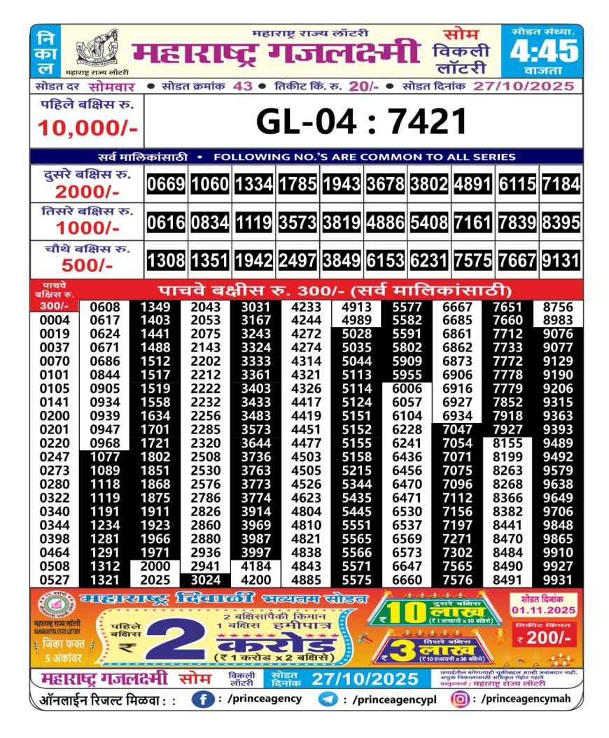 Maharashtra Gajlaxmi Weekly Lottery 4.45PM Result 27.10.2025 October 27, 2025 Leave a comment Related Results Maharashtra Gajlaxmi Weekly Lottery 4.45 Pm Result 13.05.2025 Rajshree 50 Weekly Lottery 7:30PM Result 09.10.2025 Today Kerala Lottery Result BHAGYATHARA BT 9 30.06.2025