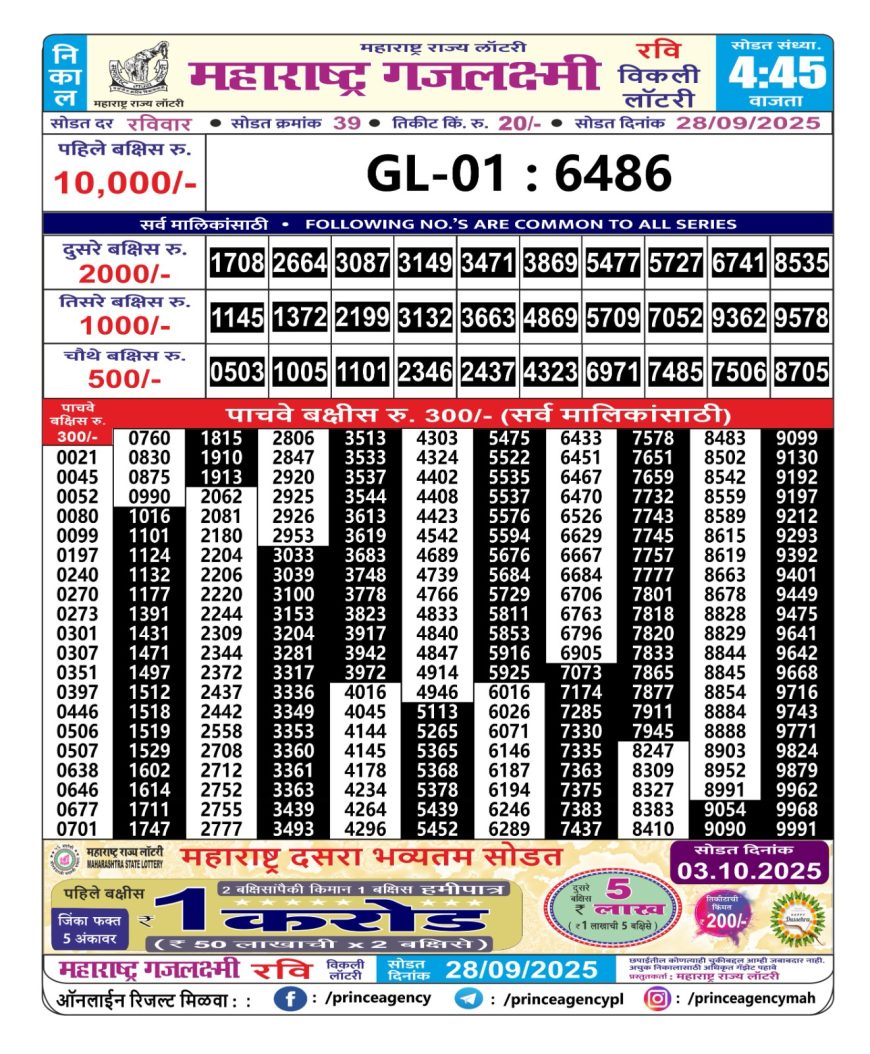 Maharashtra Gajlaxmi Weekly Lottery 4.45PM Result 28.09.2025 September 28, 2025 Leave a comment Related Results Labh Laxmi Daily Lottery 4 Pm Result 30.06.2025 Maharashtra Lottery Result Today 4Pm 24.06.2025 Maharashtra Lottery Result Today 4Pm 01.07.2025