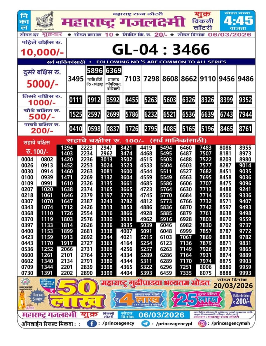 Maharashtra Gajlaxmi Weekly Lottery Result 06.03.2026 March 6, 2026 Leave a comment Related Results Maharashtra Ganeshlaxmi Lottery Result 08.01.2026 Maharashtra Ganeshlaxmi Weekly Lottery 5 Pm Result 14.06.2025 Dear 50 Daily Lottery 5 Pm Result 2.06.2025