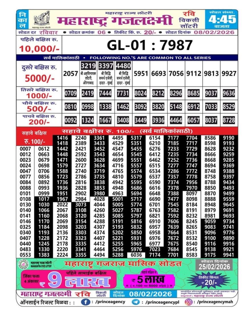 Maharashtra Gajlaxmi Weekly Lottery Result 08.02.2026