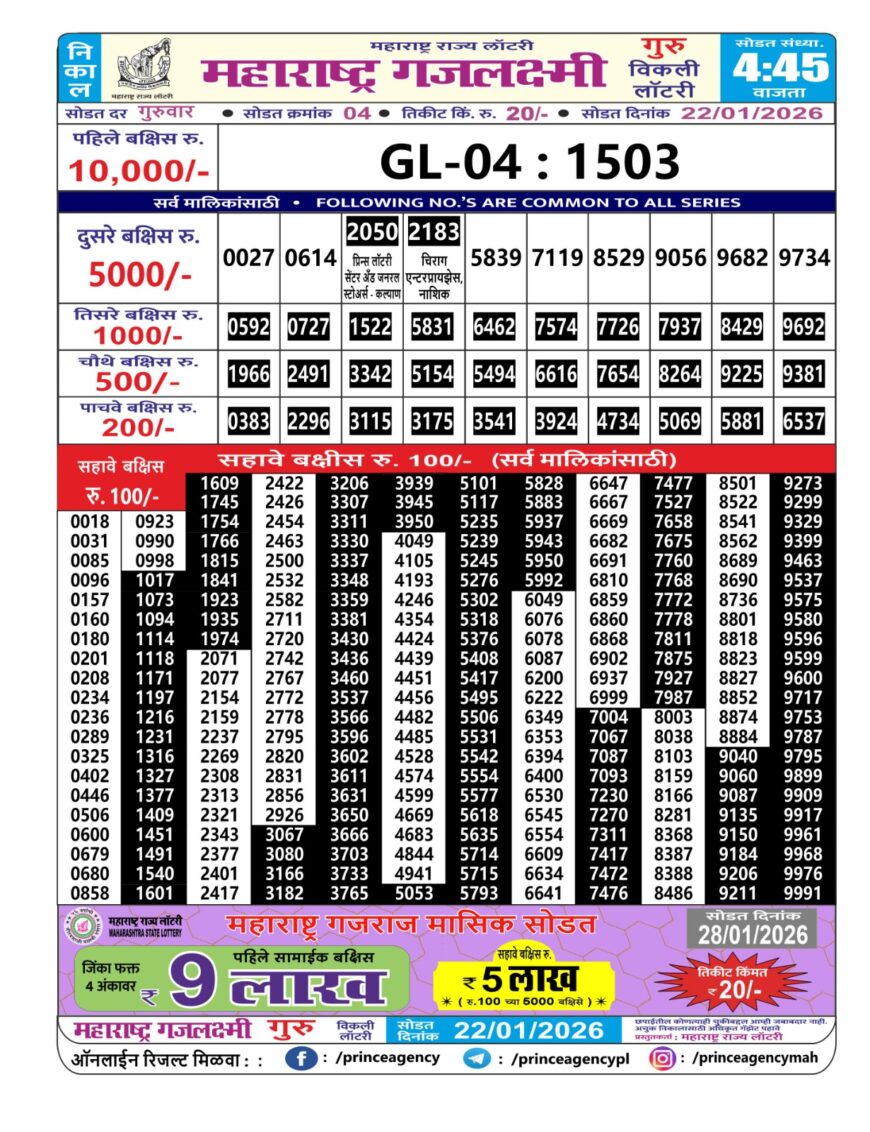 Maharashtra Gajlaxmi Weekly Lottery Result 22.01.2026
