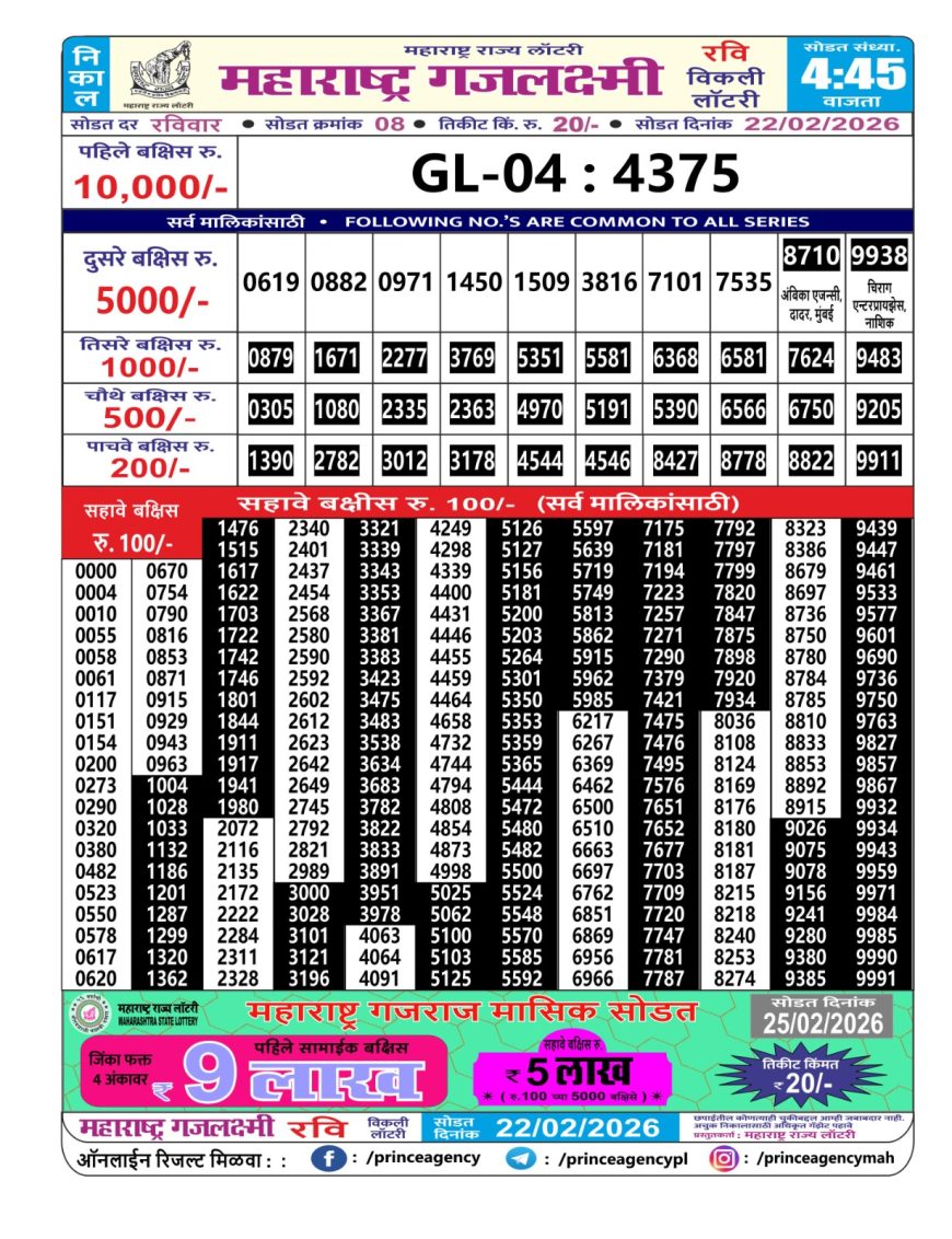 Maharashtra Gajlaxmi Weekly Lottery Result 22.02.2026