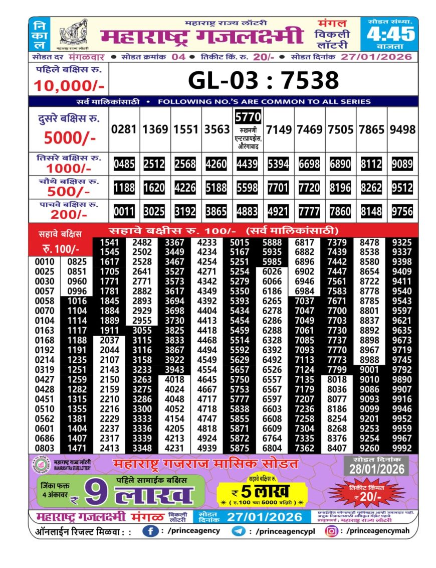 Maharashtra Gajlaxmi Weekly Lottery Result 27.01.2026 January 27, 2026 Leave a comment Related Results Punjab State Dear 10 Daily 6 Pm Result 10.06.2025 Maharashtra GaneshLaxmi Ganpati Monthly Lottery Result 4.00pm 16.09.2025 Rajshree Daily Lottery 8PM Result 13.10.2025