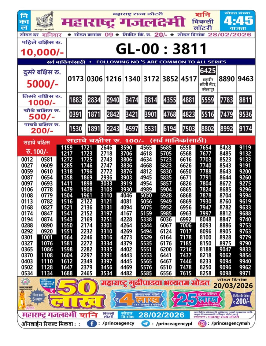 Maharashtra Gajlaxmi Weekly Lottery Result 28.02.2026