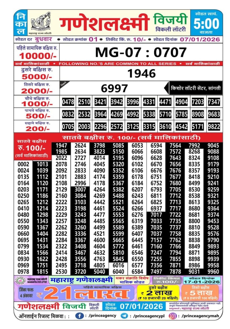 Maharashtra Ganeshlaxmi Lottery Result 07.01.2026 January 7, 2026 Leave a comment Related Results Dear 10 Daily Lottery 7 Pm Result 3.06.2025 Dear 100 Daily Lottery 5 PM Result 10.05.2025 Rajshree Night Lottery 9pm Result 13.12.2025