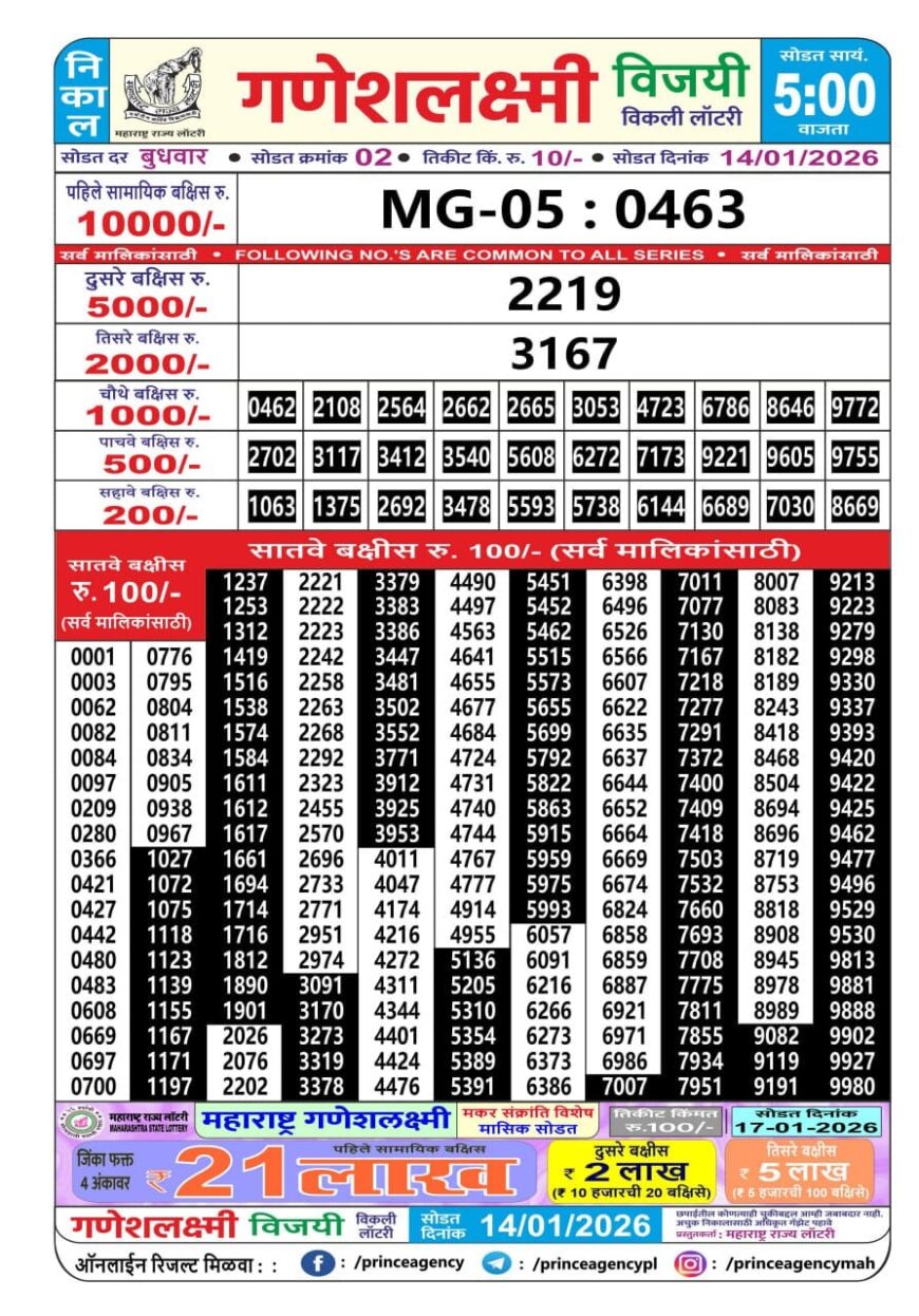 Maharashtra Ganeshlaxmi Lottery Result 14.01.2026